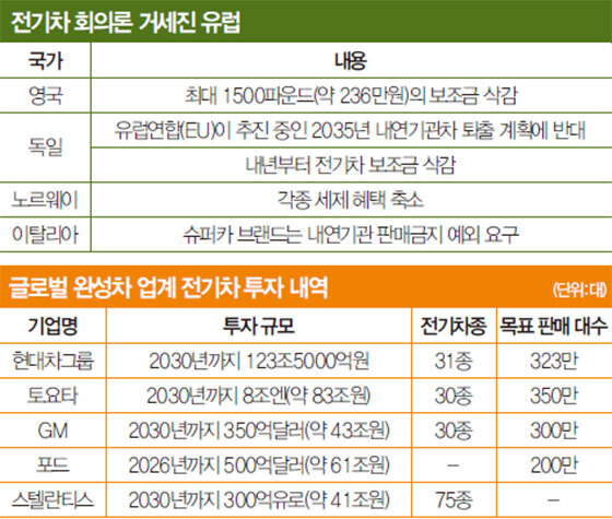 전기차 회의론의 진원지는 유럽이다. 일부 국가에서는 전기차 보조금을 폐지하는가 하면, 독일 정부는 내연기관차 판매 금지 방침을 뒤집겠다고 나섰다.