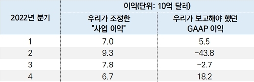 2022년 버크셔는 좋은 한 해를 보냈습니다. 버크셔의 사업이익(operating earnings)—일반회계기준(GAAP)을 사용해 계산한 이익에서 주식 보유로 인한 자본 수익이나 손실을 차감한 우리의 조정 이익—은 308억 달러를 기록했습니다. 찰리와 나는 이렇게 조정한 사업이익 수치에 초점을 맞춥니다. 여러분도 그러기를 바랍니다. 이런 조정이 없는 일반회계기준 수치는 실적 보고일마다 크게 변합니다. 2022년, 결코 특별할 것 없는 그 널뛰기 같은 일반회계기준 이익의 변화를 한 번 보지요.