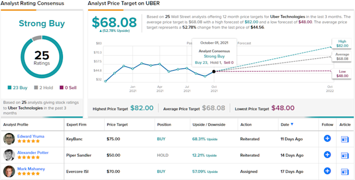 전반적으로 Uber는 월스트리트 애널리스트로부터 인상적인 23개의 Buy 등급을 받았으며 2개의 Hold와 함께 이 주식에 Strong Buy 컨센서스 등급을 부여합니다. 주식의 가격은 $44.57이고 평균 목표 가격은 $68.08로 향후 53% 성장의 여지가 있음을 의미합니다. ( TipRanks에서 UBER 주식 분석 참조 )