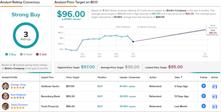 전반적으로 Brinks에는 주식에 대한 긍정적인 기대를 가진 강세 분석가의 작지만 목소리가 큰 캠프가 있습니다. TipRanks가 설문 조사한 3명의 분석가 중 3명 모두 주식을 매수로 평가했습니다. ~40%의 수익 잠재력으로 주식의 컨센서스 목표주가는 96달러입니다. ( TipRanks 에서 Brinks 의 주식 분석 참조 )