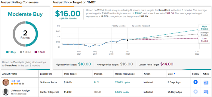 Goldman 리뷰는 이 새로 공개된 주식에 대해 기록된 두 가지 리뷰 중 하나이며 강세 리뷰입니다. 다른 하나는 보유하는 것이며 Buy-Hold 분할은 주식에 Moderate Buy 합의 보기를 제공합니다. 평균 목표주가 $16은 현재 주가 $13.13에서 ~19%의 상승 여력을 의미합니다. ( SMRT 주식 분석 TipRanks 참조 )